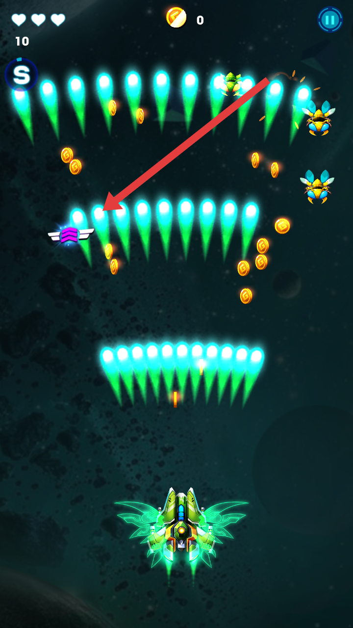 2、需要优先获取标有S的蓝色道具,激活后触发多排绿色子弹,大幅提升火力,快速清屏并增收金币。