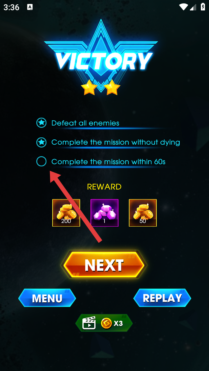 3、在界面结算可以知道如果想要获得三星,需要完成消灭所有敌人、无伤通关、尝试60秒内完成关卡这三个要求。