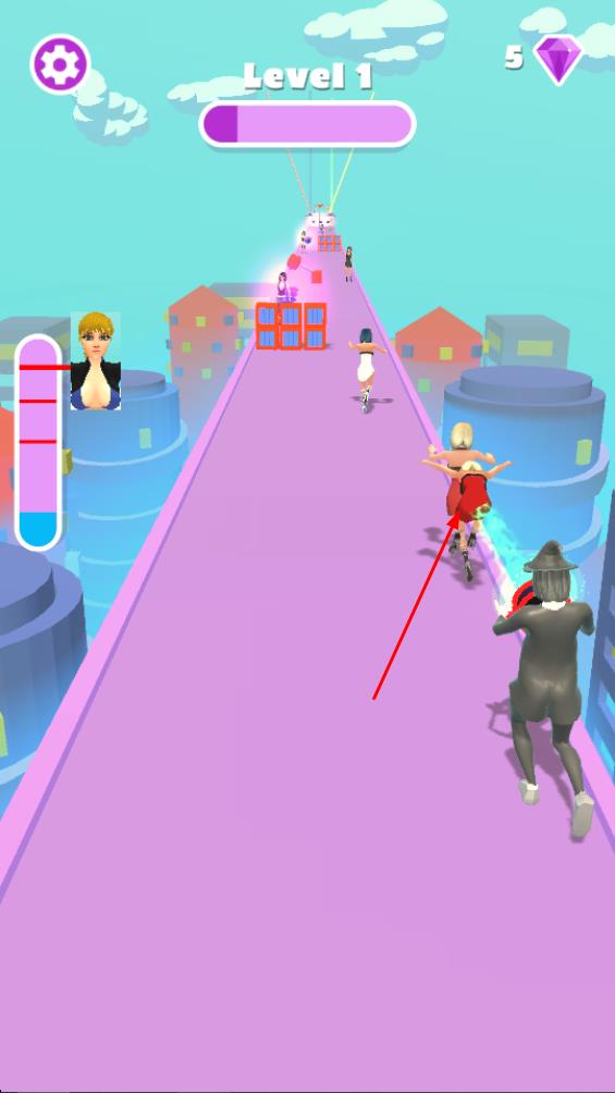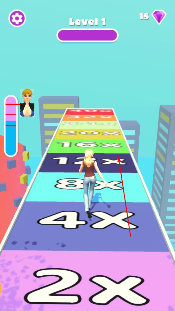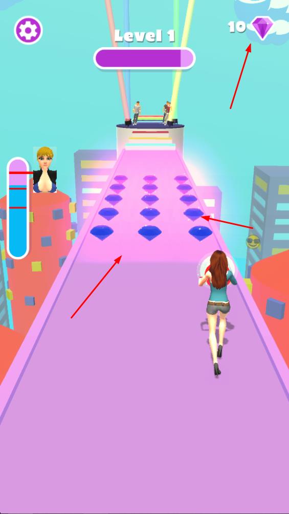 1、在城市场景中,操控女性角色,通过滑动屏幕调整移动方向,躲避障碍物,收集钻石,积累分数。