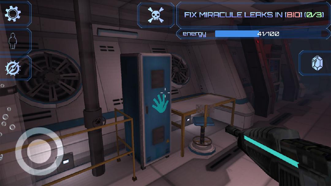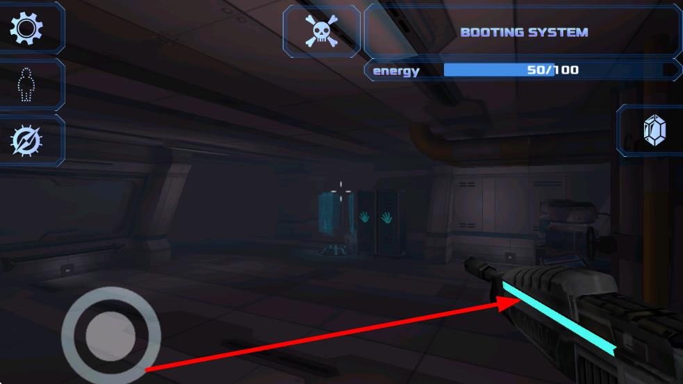 1、进入后,通过虚拟摇杆移动角色,触发恐怖事件并获取武器。
