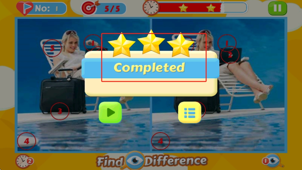 3、找齐5处不同后,界面显示Completed及三星评价,点击绿色箭头按钮进入下一关,或黄色按钮查看关卡列表。