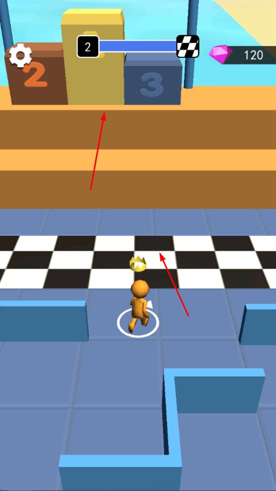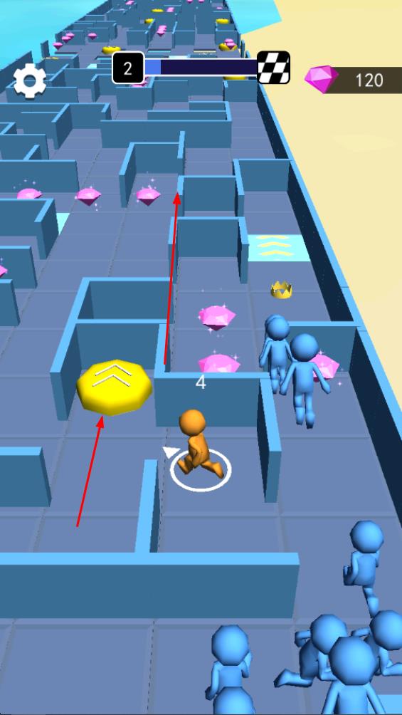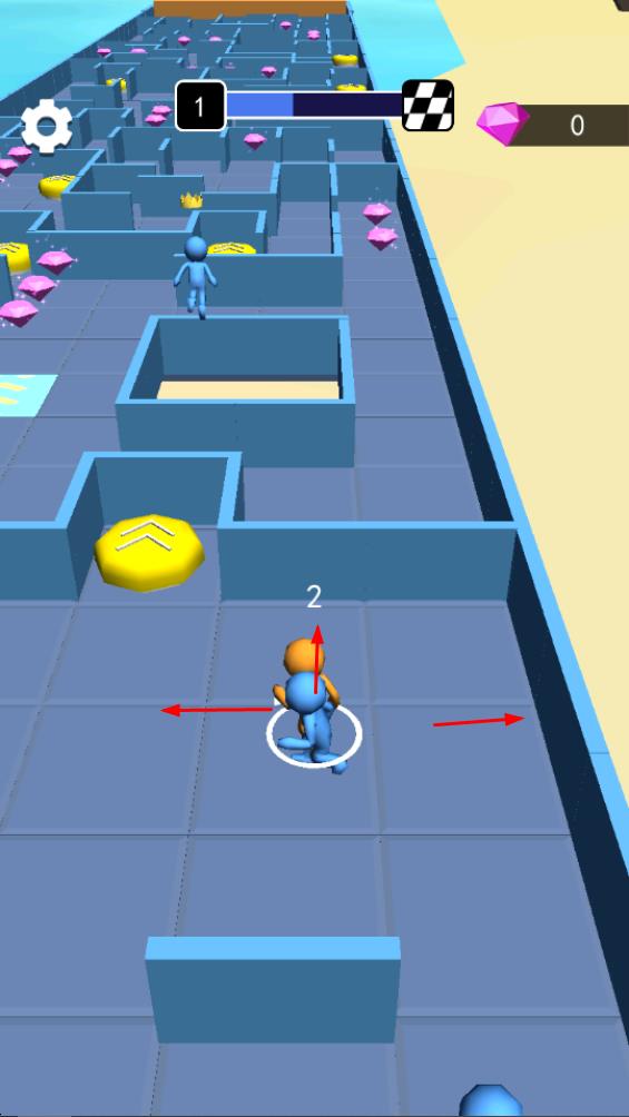 1、在迷宫场景中,操控蓝色小人或橙色小人,通过滑动屏幕调整移动方向,躲避障碍物,收集宝石,积累数量。