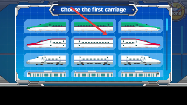 1、进入选车厢界面,按喜好选首节车厢如绿色车头,观察画面来完成,两辆车行驶。