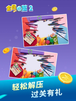 全民找茬2游戏画面采用高饱和度色彩搭配,场景设计层次分明,差异点设置巧妙且富有挑战性,能让玩家长时间保持高度专注和游戏热情,多人合作模式打破传统单机游戏的孤独感,在轻松愉快的氛围中促进亲友间的情感交流,特别适合在家庭聚会或朋友聚餐时共同游玩。
