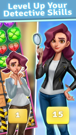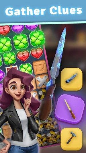 1、玩家需要通过匹配三个相同颜色的方块来消除障碍,逐步解锁新的调查区域和案件线索,推动故事情节发展,体验解谜的乐趣。