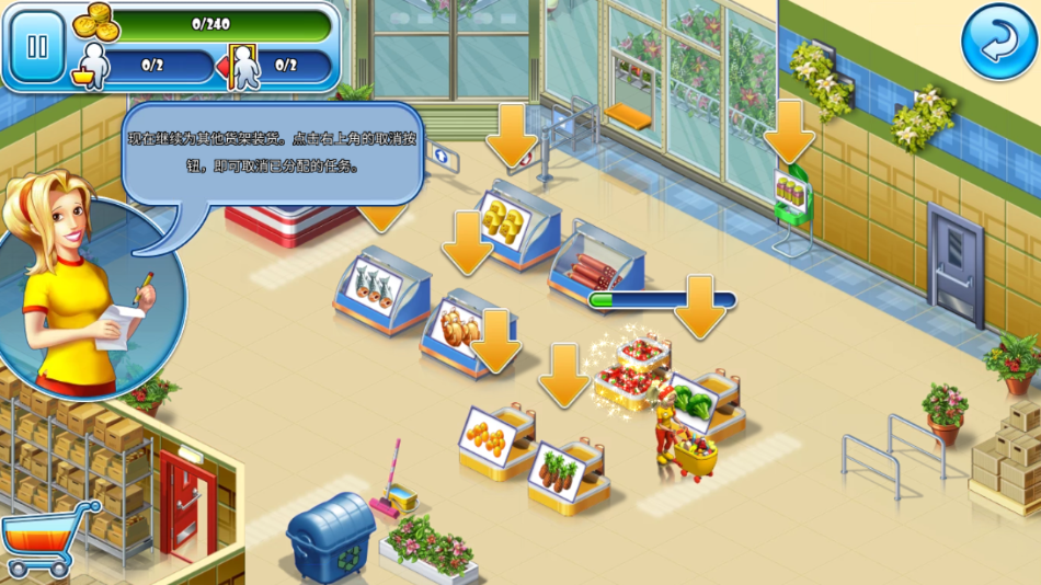 2、游戏中途,在97个关卡中管理六个独特商店,服务十种挑剔客户,及时补货、升级货架与冰箱提升库存,应对各类经营挑战。