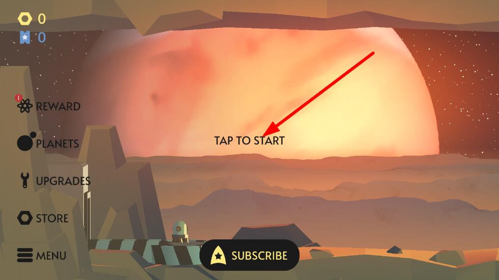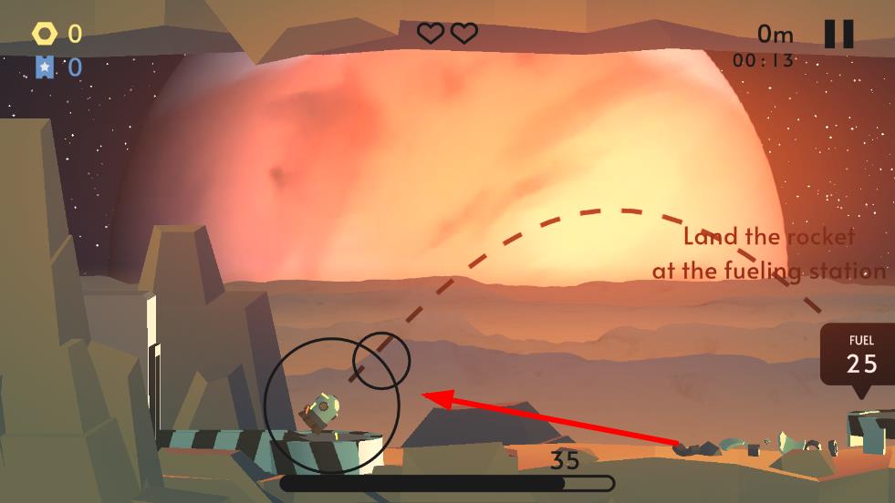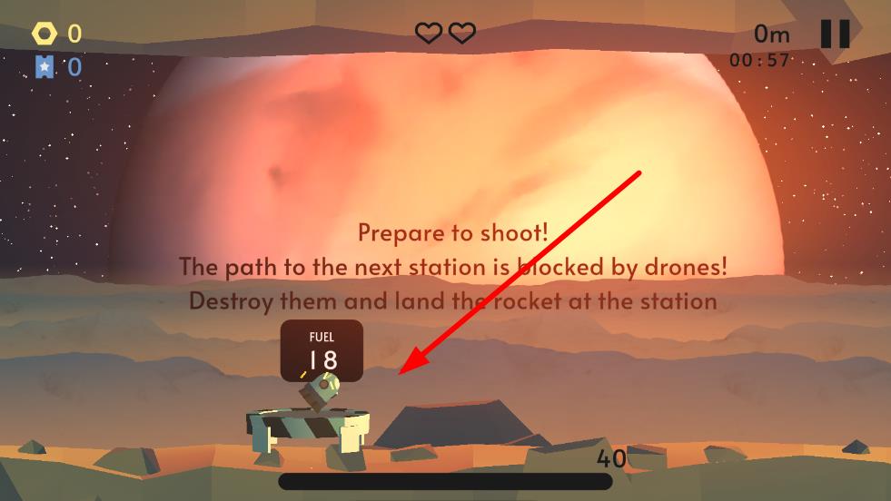 1、进入游戏,点击“TAP TO START”开启关卡,观察场景布局,明确火箭起点、目标站点,如燃料站及障碍或无人机分布。