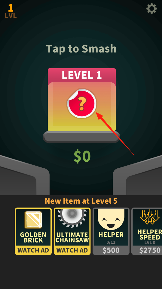 1、来到游戏初始界面,能看到LEVEL1的神秘方块,上面有问号标记,点击这个方块,开启第一关挑战,方块会被击碎,露出里面的内容,同时获得奖励。