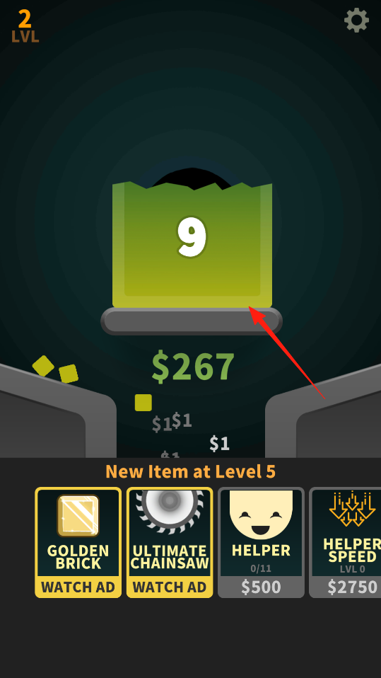 2、进入第二关,绿色方块上显示数字9,这代表需要击碎的次数或层数,持续点击方块,让它逐步破碎,破碎过程中会掉落金币,积累这些金币,可用于购买下方道具。