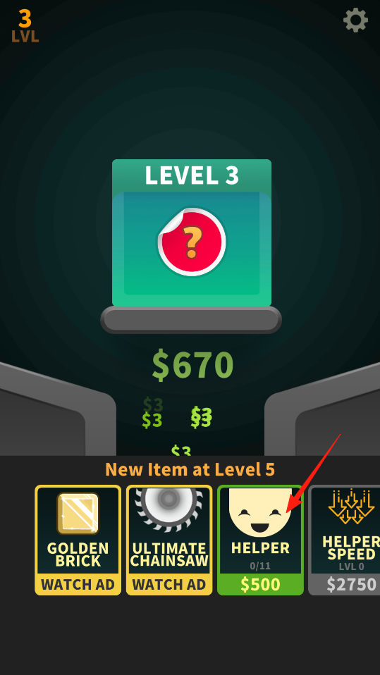 3、到了第三关,蓝色方块等待挑战,下方HELPER道具已可购买,花费500金币解锁HELPER,它会辅助击碎方块,加快闯关速度,点击方块开始挑战。