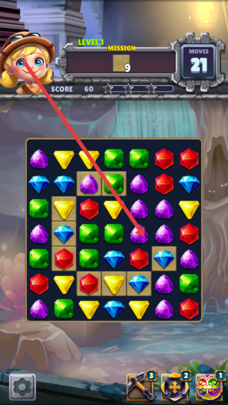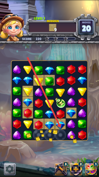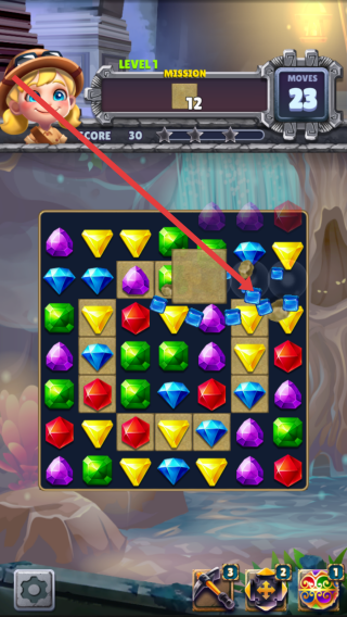 1、进入消除的游戏页面,先观察宝石布局,优先消除目标区域带着棕色土块的,解锁下方宝石。