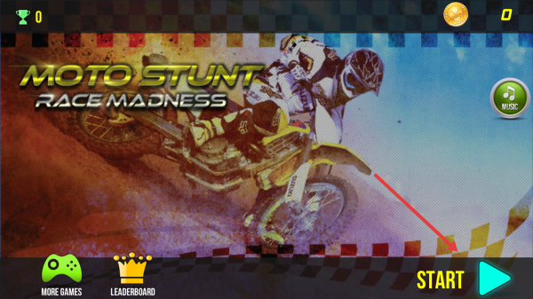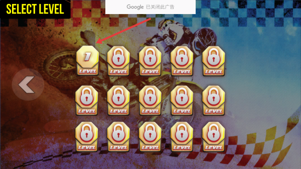 1、点击START进入游戏,在关卡选择界面,优先选Level1,熟悉摩托操控与赛道规则,开启竞速。