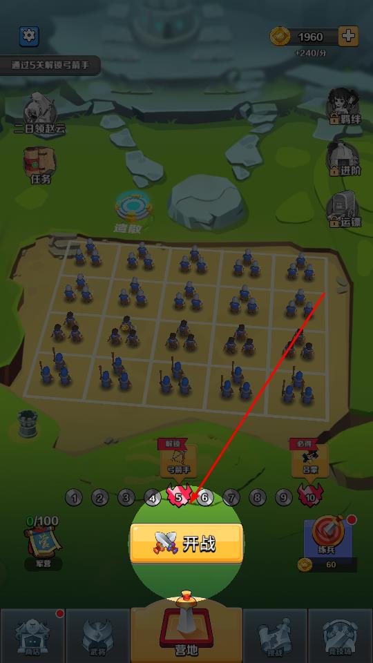 1、在营地界面,确认士兵排布与关卡进度,首先需要点击开战按钮,开启战斗流程。