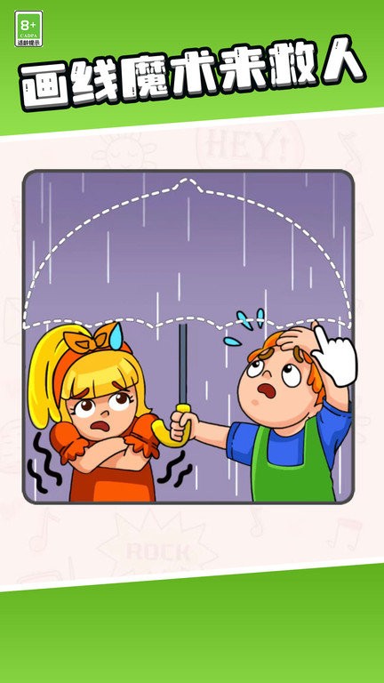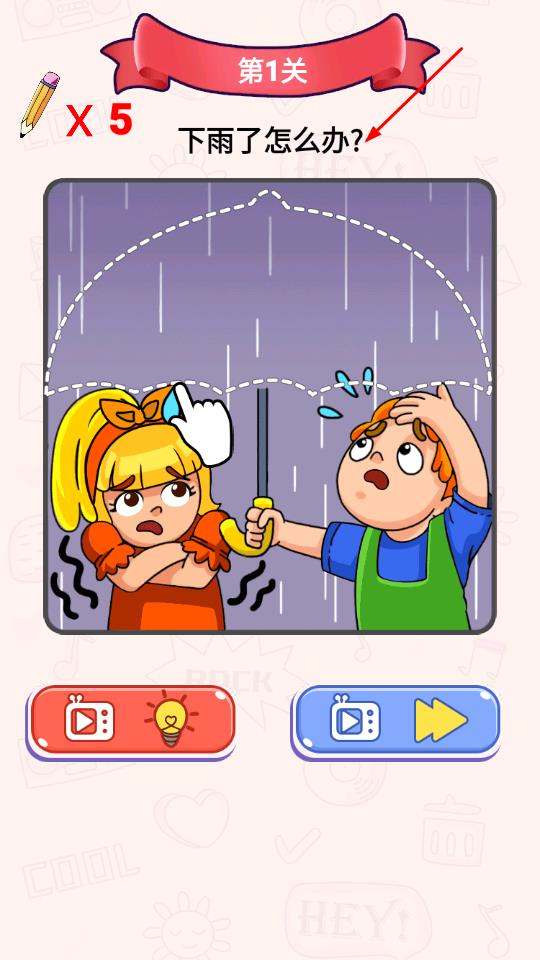 2、面对关卡问题如下雨,沿虚线绘制图形如补全雨伞,助力角色应对状况,体验画线魔法。