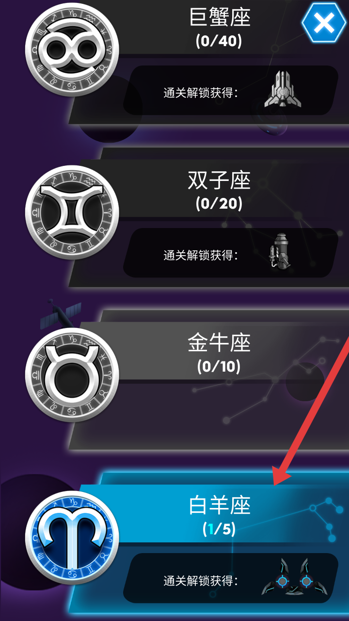 1、进入星座关卡的界面,选择白羊座1/5的关卡,开启对应的挑战,推进星座主题关卡进程。