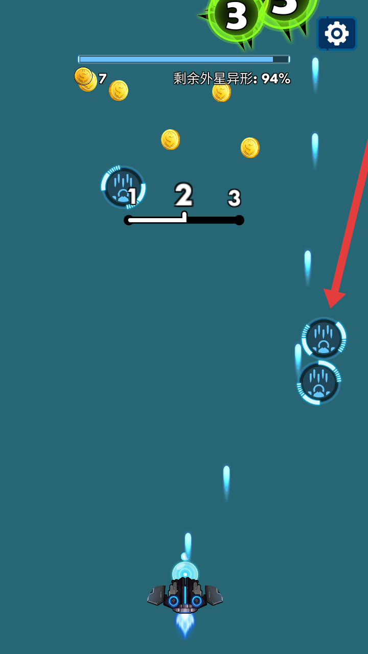 2、在战斗时瞄准上面圆形数字的敌人,消灭敌人会出现道具和金币,需要操控飞船进行收集。