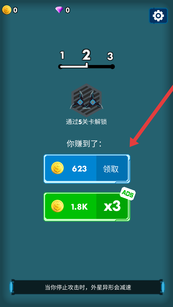 3、关卡结算后,点击蓝色领取的按钮,获取623的金币,可以积累资源用于后续升级或解锁。
