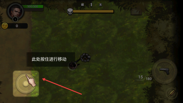 1、点击开始战斗进入第1天场景,按住摇杆移动角色熟悉操作,留意敌人僵尸出现方向。