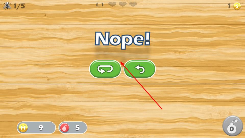 3、若未击中苍蝇,出现Nope!提示时,点击左侧绿色重玩按钮,重新尝试本关卡挑战继续游戏。