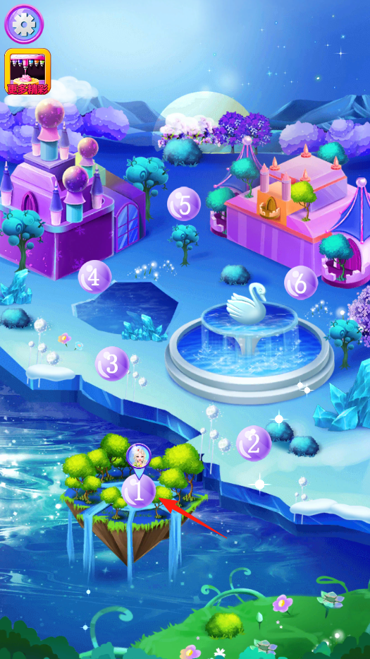 2、来到游戏场景地图,紫色调的童话世界里分布着标有数字的圆形关卡入口,点击1号关卡,进入第一章故事挑战,完成该关卡任务后,逐步探索整个童话地图。