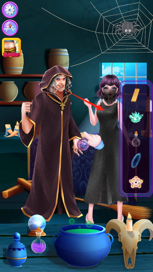 3、进入关卡内的魔法场景,面对巫师和神秘角色,右侧有道具栏,拖动道具栏中的物品,放入下方魔法锅,或对角色使用,完成魔法相关任务,通过道具交互推动剧情。