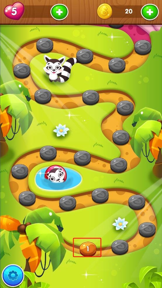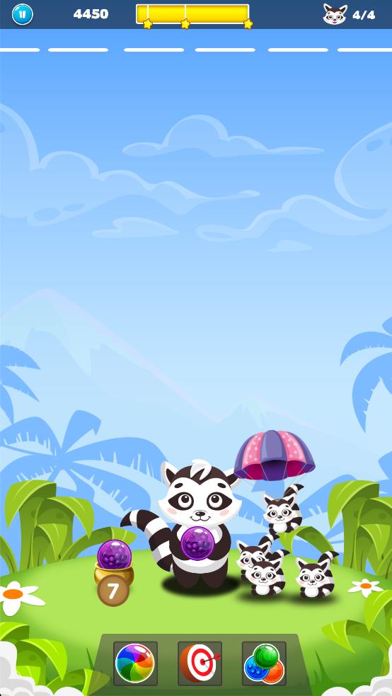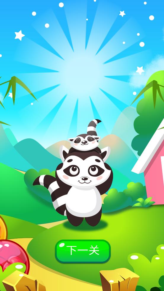 2、屏幕上漂浮着彩色泡泡,小浣熊宝宝藏在部分泡泡里,滑动手指连接同色泡泡,消除的瞬间宝宝会向下掉落一段距离。