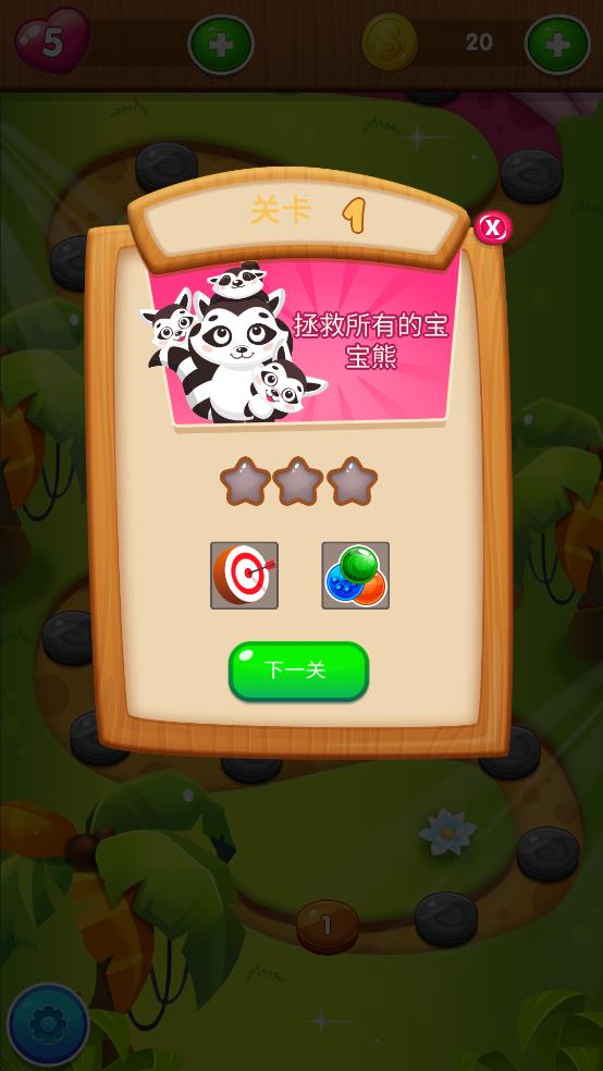 3、障碍巧妙规避:部分关卡中存在带刺的气球或移动的云朵障碍,消除时需规划路径,让宝宝下落时避开这些危险,确保最终安全抵达浣熊妈妈身边。