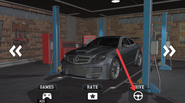 1、在c63停车专家的车库界面,点击右下角带方向盘图标的DRIVE按钮,进入驾驶的场景开启游戏。