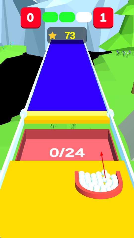 3、随着游戏推进,赛道颜色和布局会发生变化,如出现蓝色赛道,同时下方的收集区域会显示需要收集的白色物体数量,需持续发射白色物体。