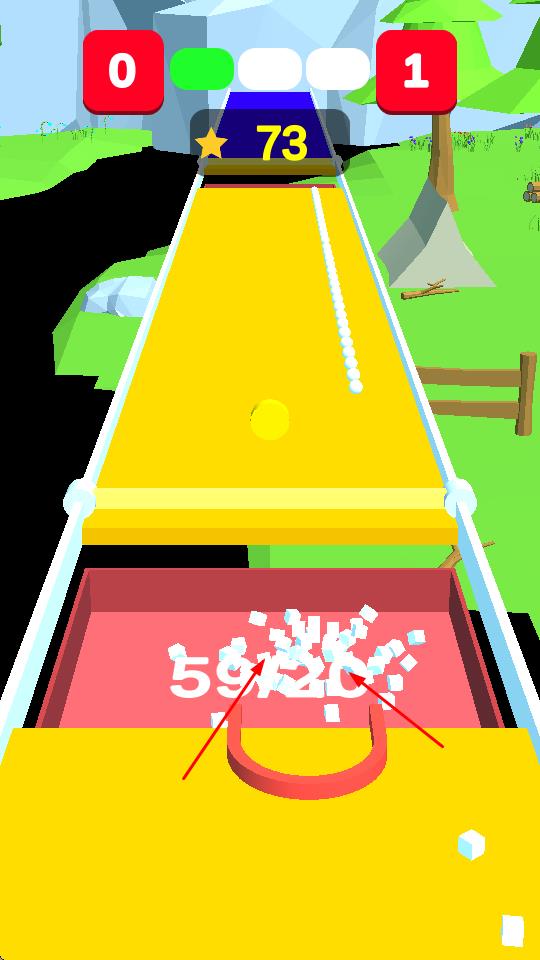 2、在发射过程中,留意赛道上的白色方块和数字标识,合理规划发射角度和力度,使白色物体能够顺利前进并积累数量。
