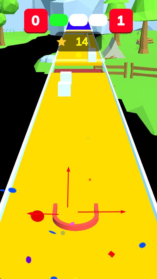 1、进入游戏后,操控红色U型道具,通过左右移动和发射操作,将白色方块状物体发射到黄色赛道上,使其沿着赛道前进。