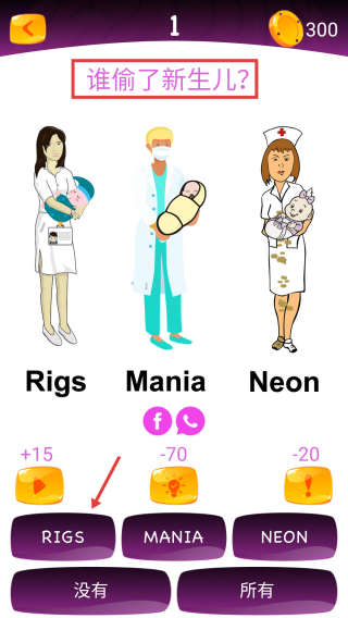 2、观察角色细节如护士抱的是玩偶,分析线索,选择对应答案如RIGS。