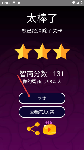 3、答对后,点击继续,进入下一关,挑战更多烧脑谜题,积累智商分数。