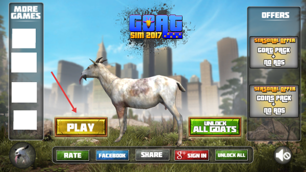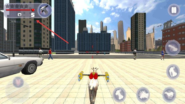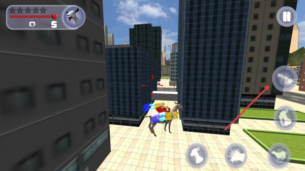 1、点击PLAY进入游戏操控山羊在城市场景移动熟悉虚拟按键功能留意血量与技能图标。