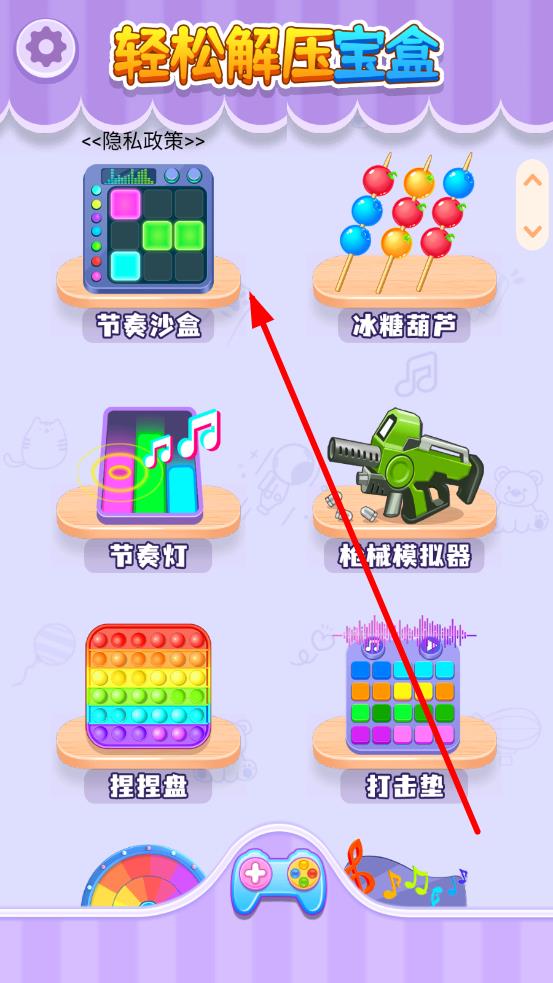 1、浏览主界面丰富功能图标,点击如“节奏沙盒”等玩法专属入口,严格按引导熟悉基础操作流程,顺利开启解压玩法的初次体验,快速融入游戏世界。