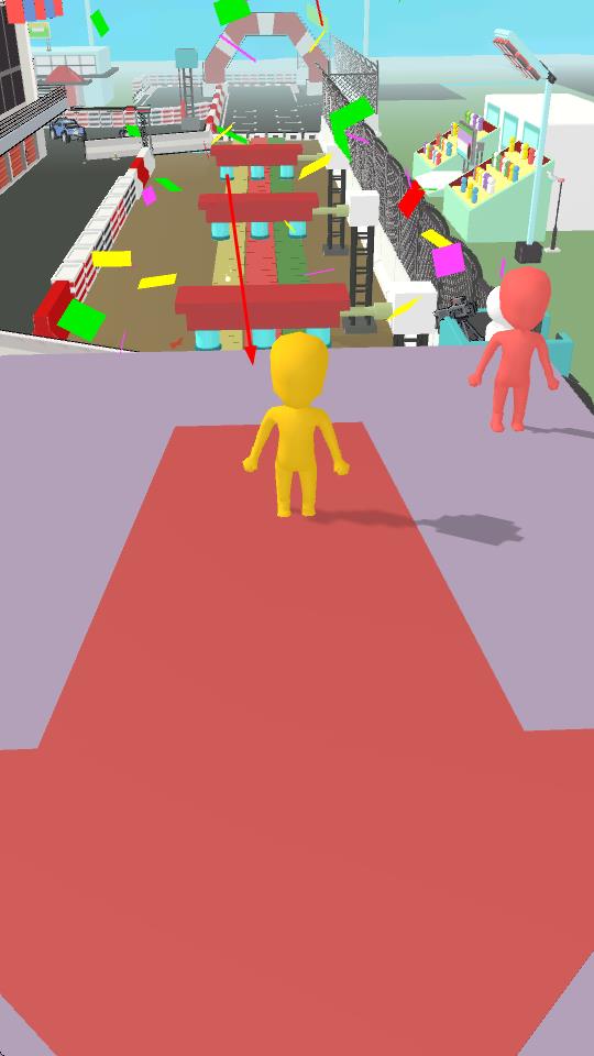 3、随着游戏推进,赛道上会出现更多障碍物和复杂的场景布局,如红色的桥梁状障碍物,需灵活操控小人移动和跳跃,避开障碍物,率先到达终点,完成关卡任务,获取游戏胜利。