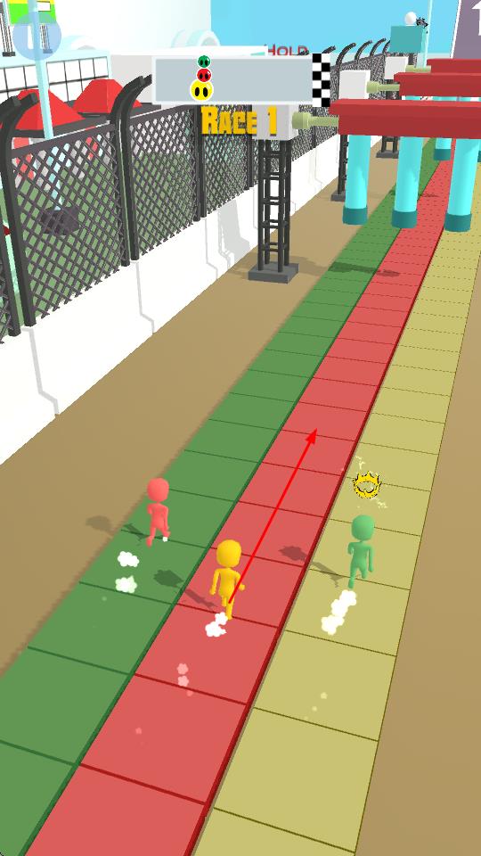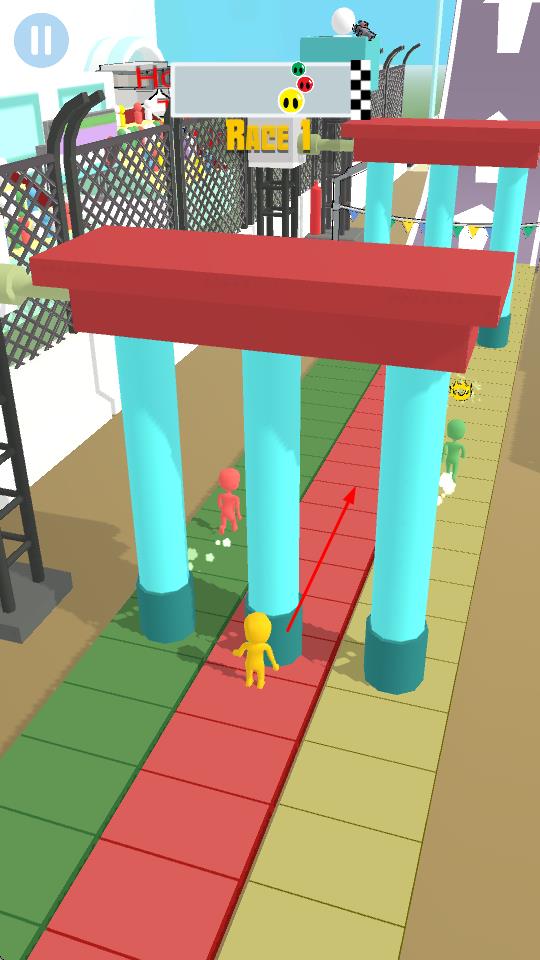 1、进入游戏后,操控黄色小人在赛道上奔跑,通过左右移动等操作,避开障碍物,超越其他颜色的小人。