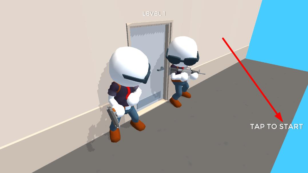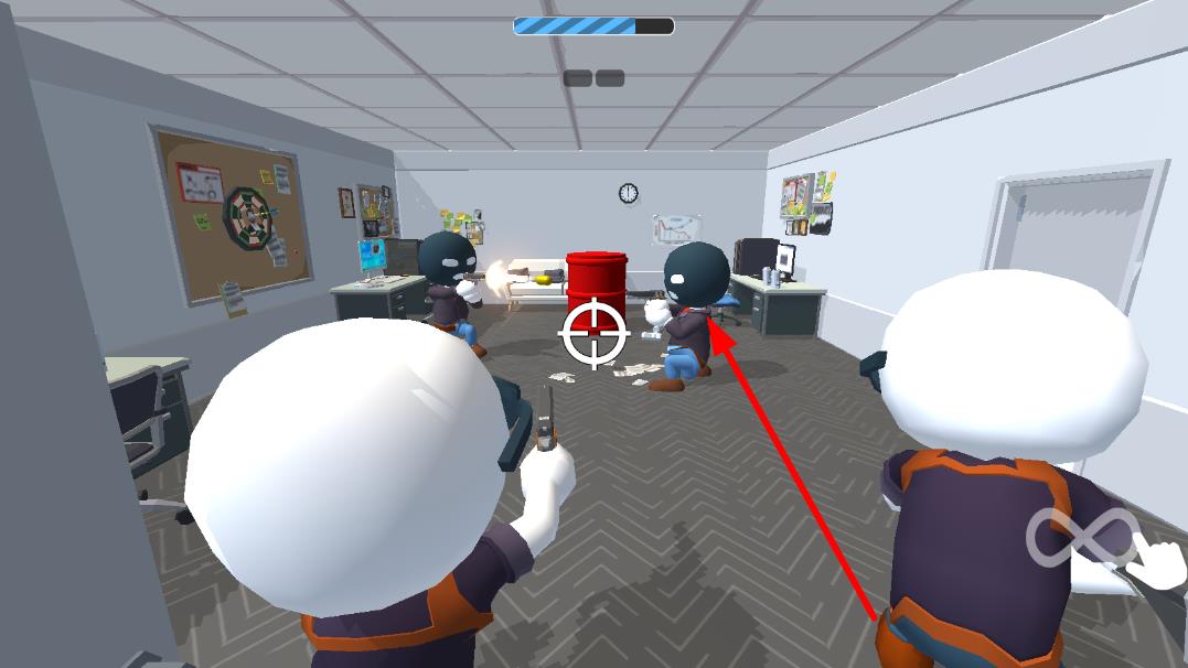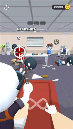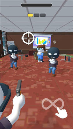 1、武器射击操作:拿起武器瞄准劫匪射击,利用无限子弹持续攻击,通过点击或长按触发射击,命中劫匪可将其消灭。