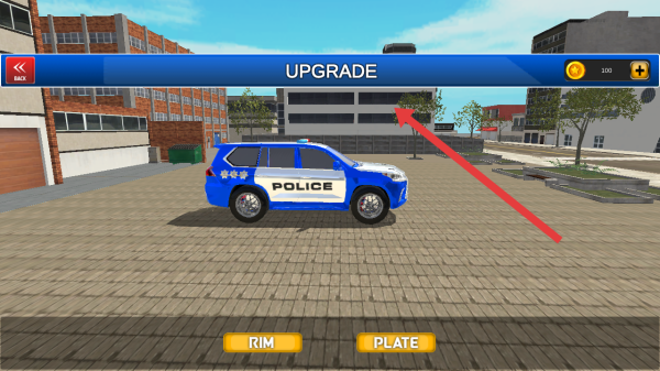 1、进入UPGRADE界面,可以使用金币升级警车,如点击RIM和PLATE的按钮提升车辆的性能。