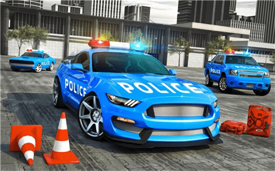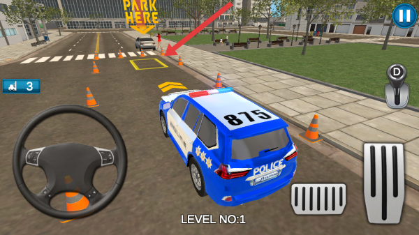 2、在停车关卡,操控警车避开橙色锥桶,精准驶入上方PARK HERE指示的黄色区域,完成Level1挑战。