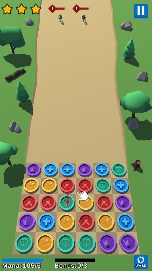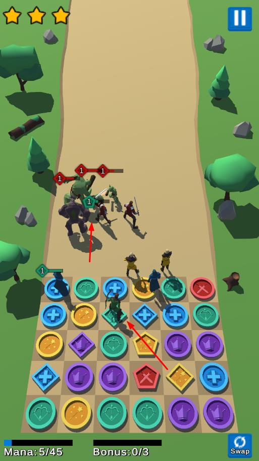 2、消除符文召唤对应兵种,如绿色符文召唤射手,布置在棋盘,阻挡敌方进入。