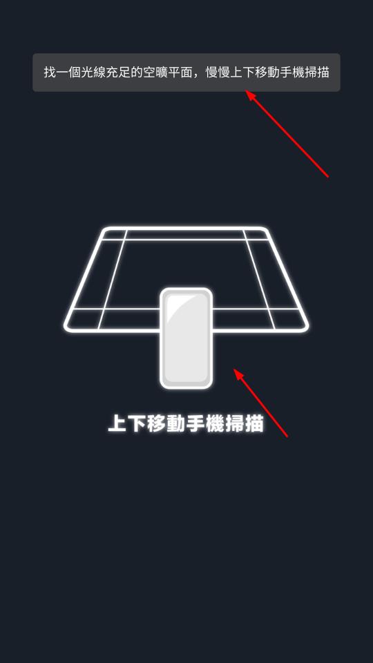 3、按提示找光线充足空旷平面,上下移动手机扫描,完成场景互动,助力游戏关卡推进。