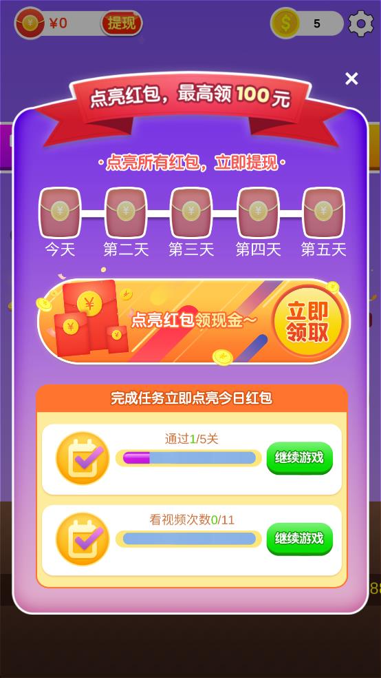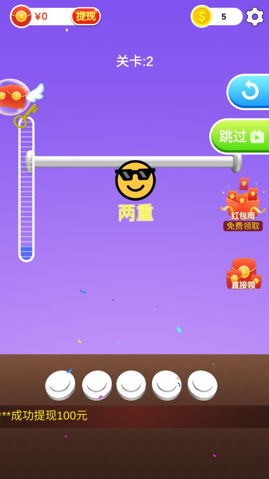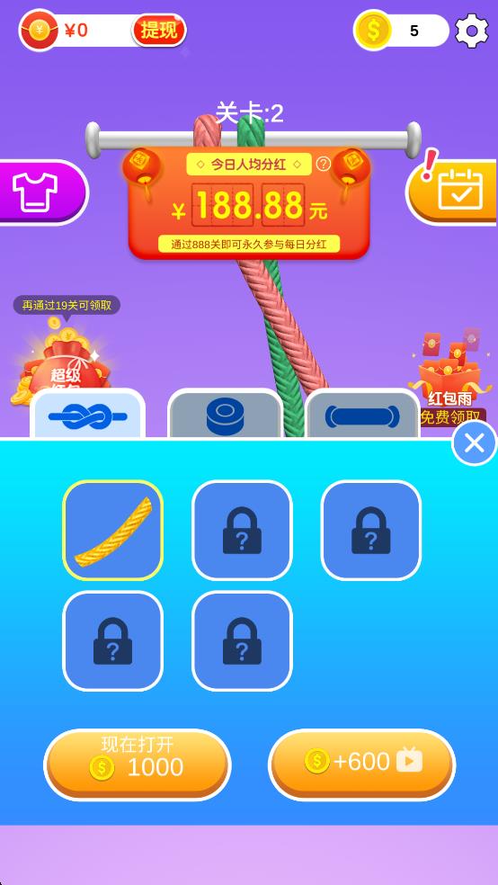 3、绳索完全解开后可以领取5金币奖励,可看广告获得3倍奖励,积累金币解锁新关卡、道具,提升解绳效率。