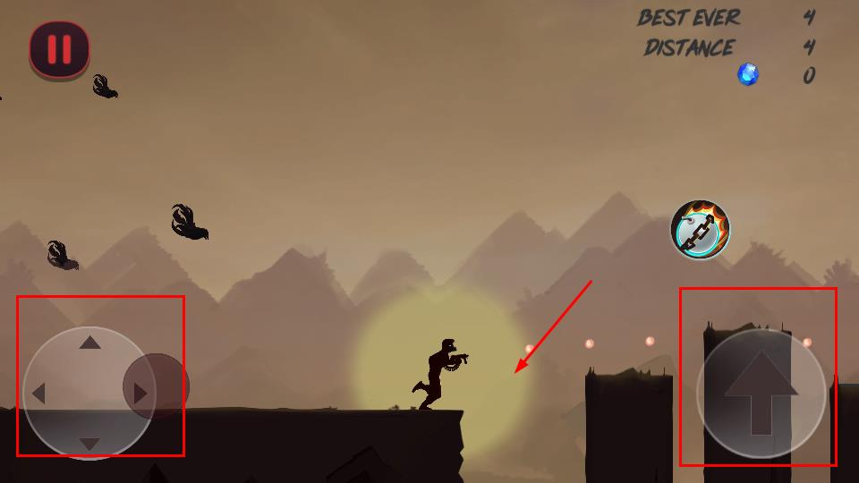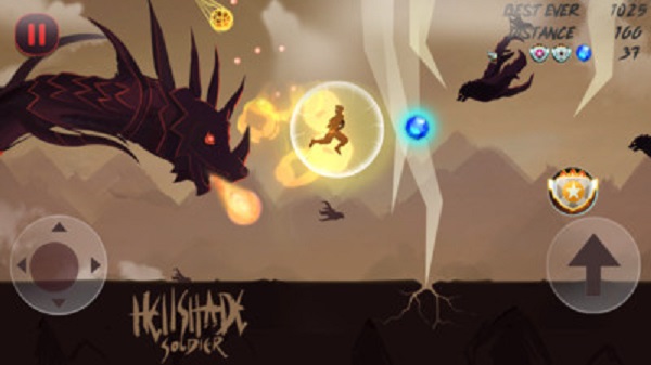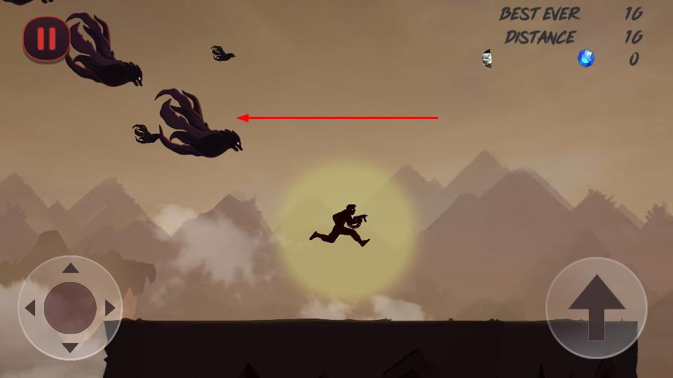 2、利用左侧方向按键控制移动,右侧按键完成跳跃,遇怪物时射击攻击,跨越地形障碍,持续向前冲刺。