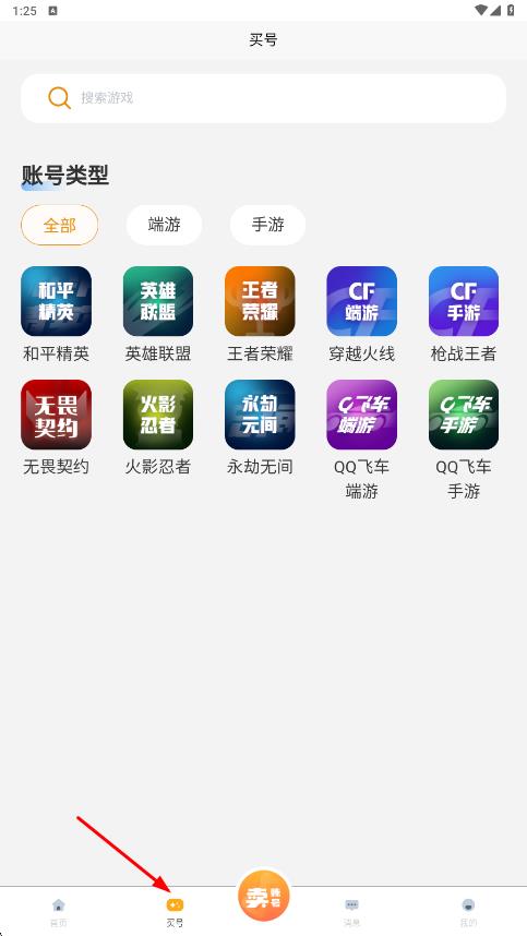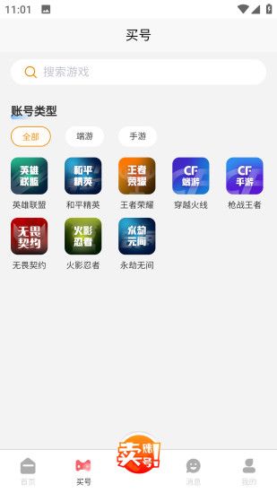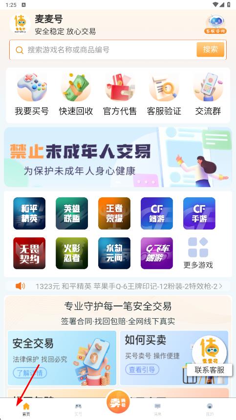 1、下载并打开麦麦号app,完成注册登录,在首页搜索栏输入想购买的游戏账号或物品名称,浏览相关信息。