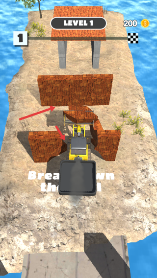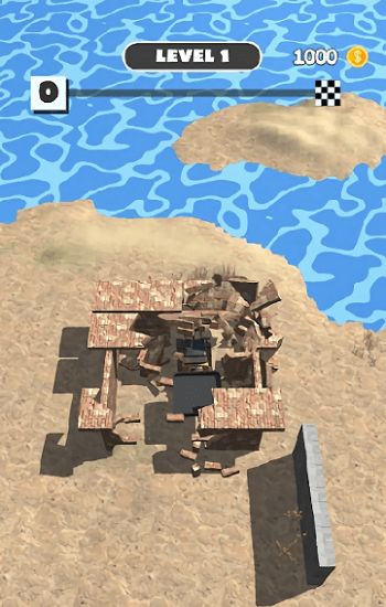 1、操控推土机推土粉碎:用摇杆控制推土机在场景中移动,对准需要粉碎的物品或建筑,将其推平、粉碎,通过持续操作积累分数,达到关卡要求即可通关。