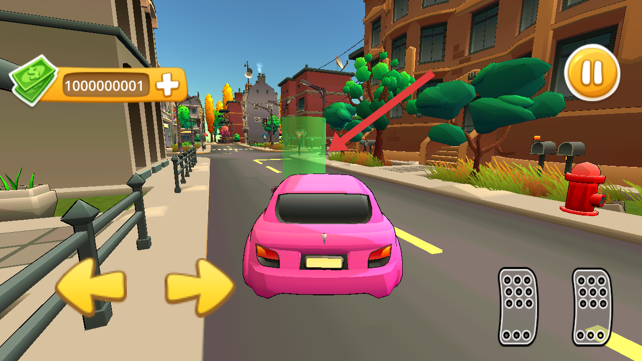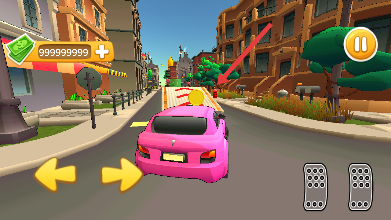 1、需要通过左侧箭头按钮转向、右侧踏板控速,驾驶粉色汽车冲上红白条纹坡道,顺便收集路面金币。