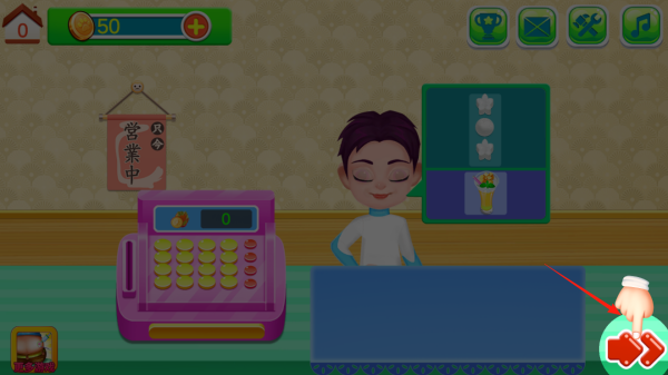 2、在游戏经营界面,看到角色与收银台及右侧订单展示,点击右下角红色箭头样式按钮,推进订单处理流程,根据订单需求准备对应日式点心,与角色互动完成交易。