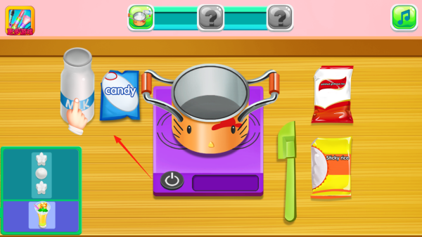3、来到食材准备界面,有牛奶糖果等食材及烹饪锅具,根据指引点击牛奶等食材,将其加入锅中,按照步骤组合食材,借助烹饪操作机制,制作日式点心所需原料。