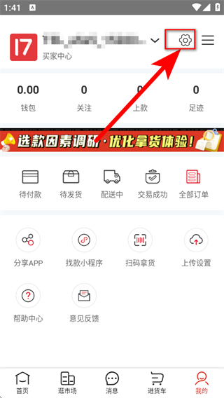 1、打开17货源APP点击底部导航栏中的我的选项进入页面,接着点击页面右上角的设置图标。